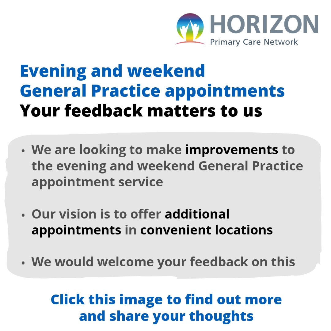 We have been listening to feedback about what patients value most when accessing general practice appointments out of normal hours. More specifically we have been exploring how we might improve access for patients registered with one of the seven GP practices that Horizon Primary Care Network (PCN) represents, the seven practices are*: